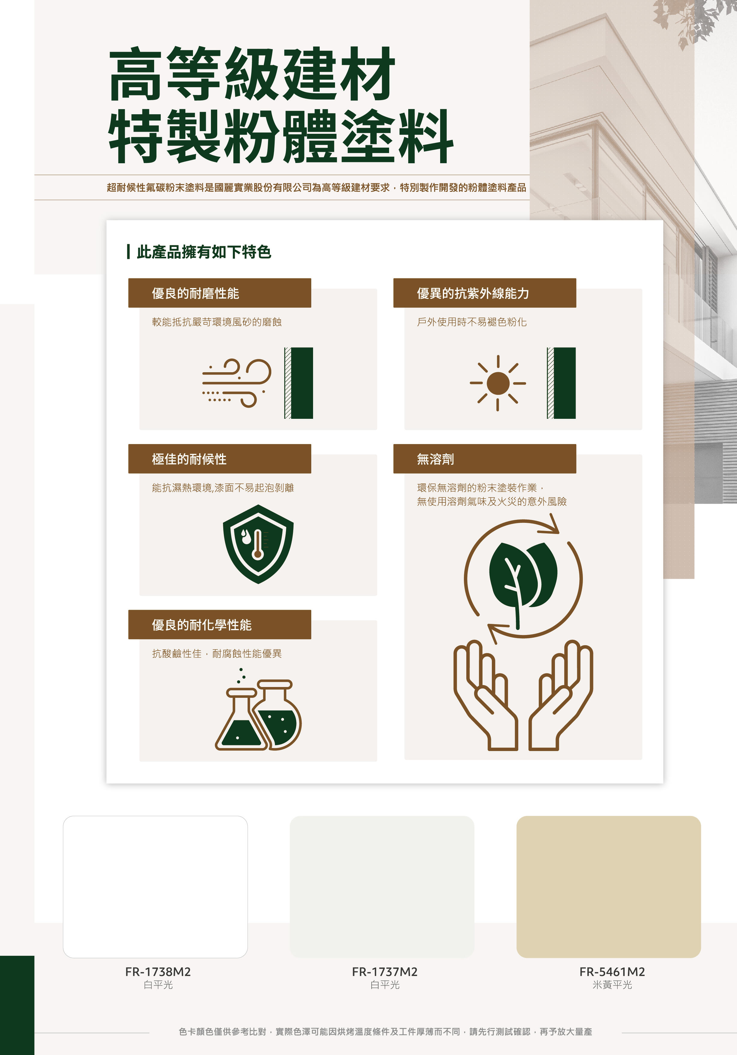 超耐候性氟碳粉末塗料是國麗實業股份有限公司為高等級建材要求,特別製作開發的粉體塗料產品。