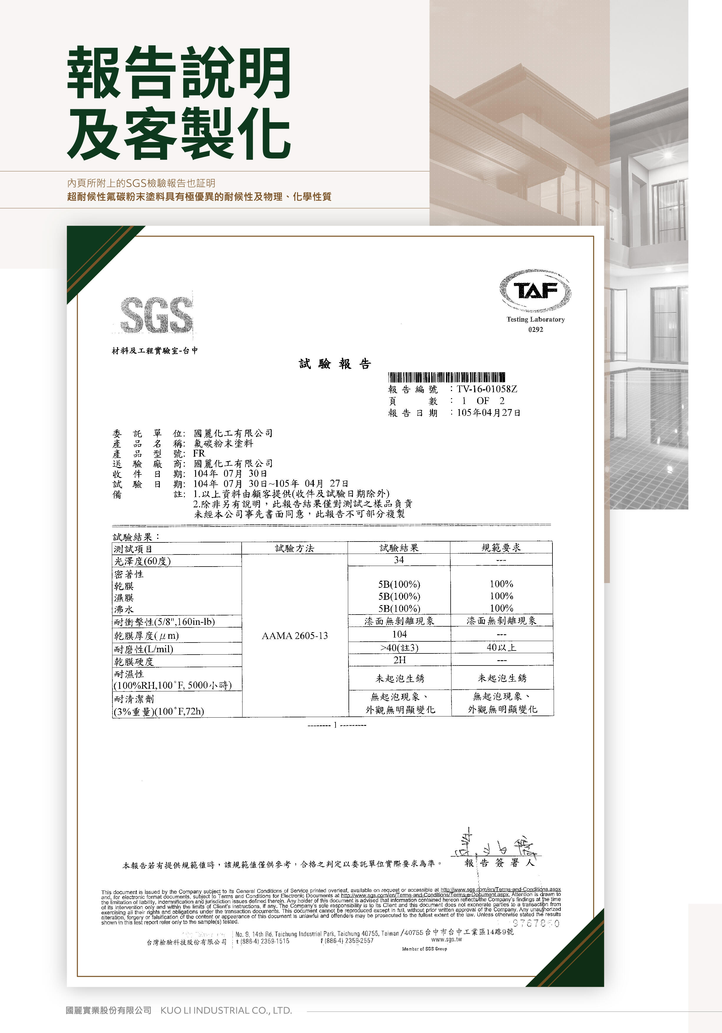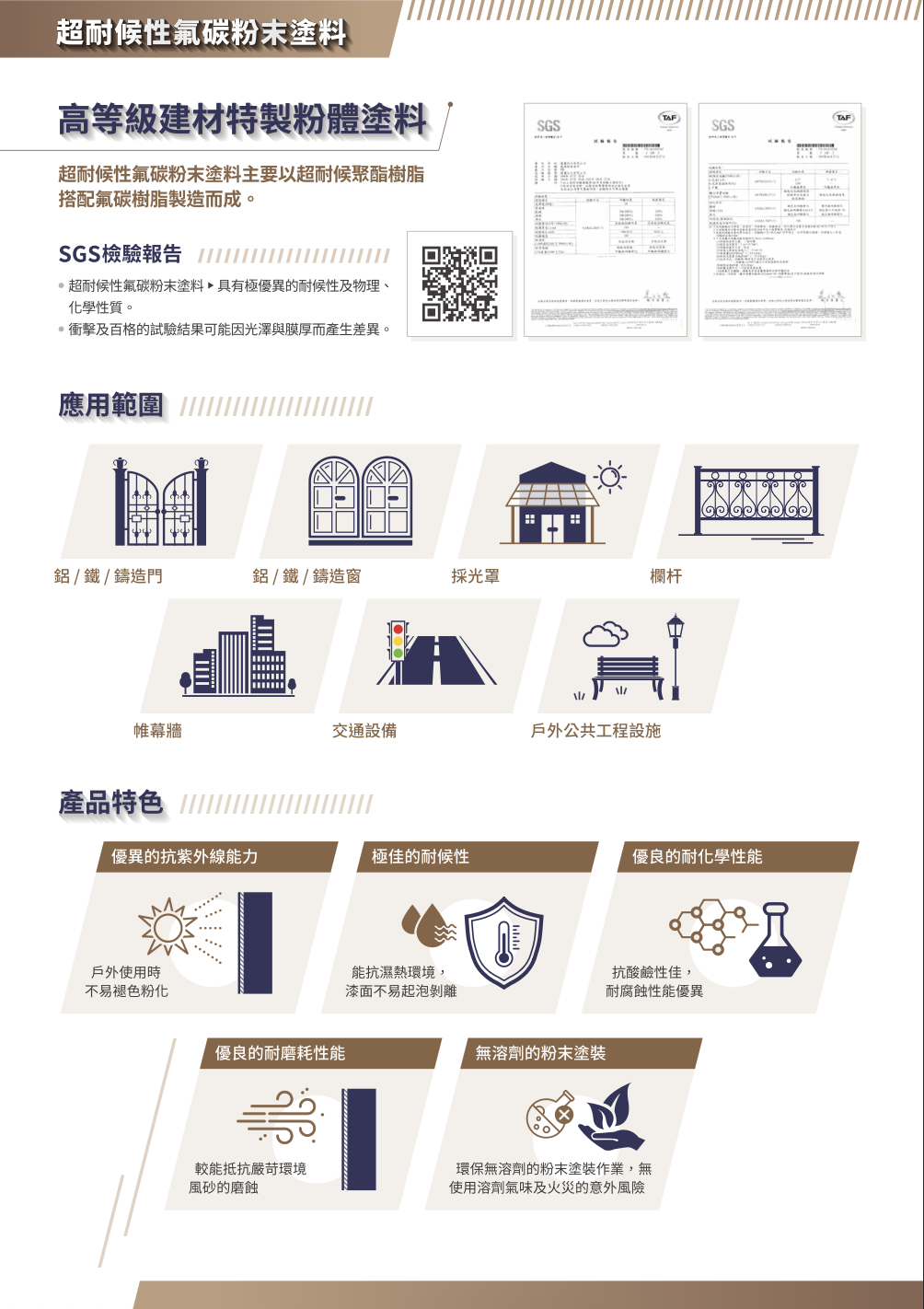 內頁所附上的SGS檢驗報告也證明 超耐候性氟碳粉末塗料具有極優異的物理、化學性質。此類粉體塗料可廣泛應用在鋁門、鋁窗、鐵門、鐵窗鑄造、門窗、採光罩、欄杆、帷幕牆、交通設備戶外公共工程設施等。