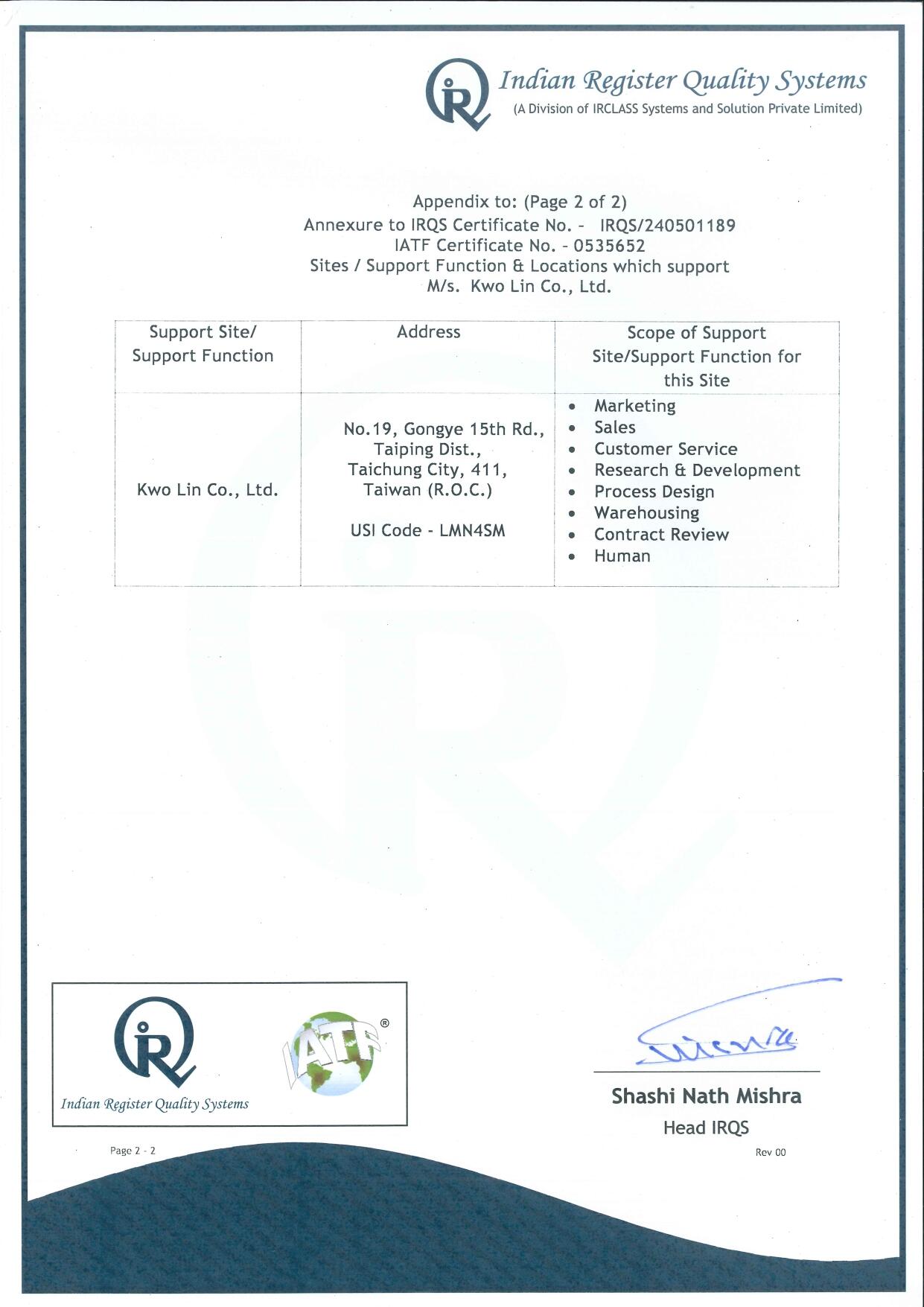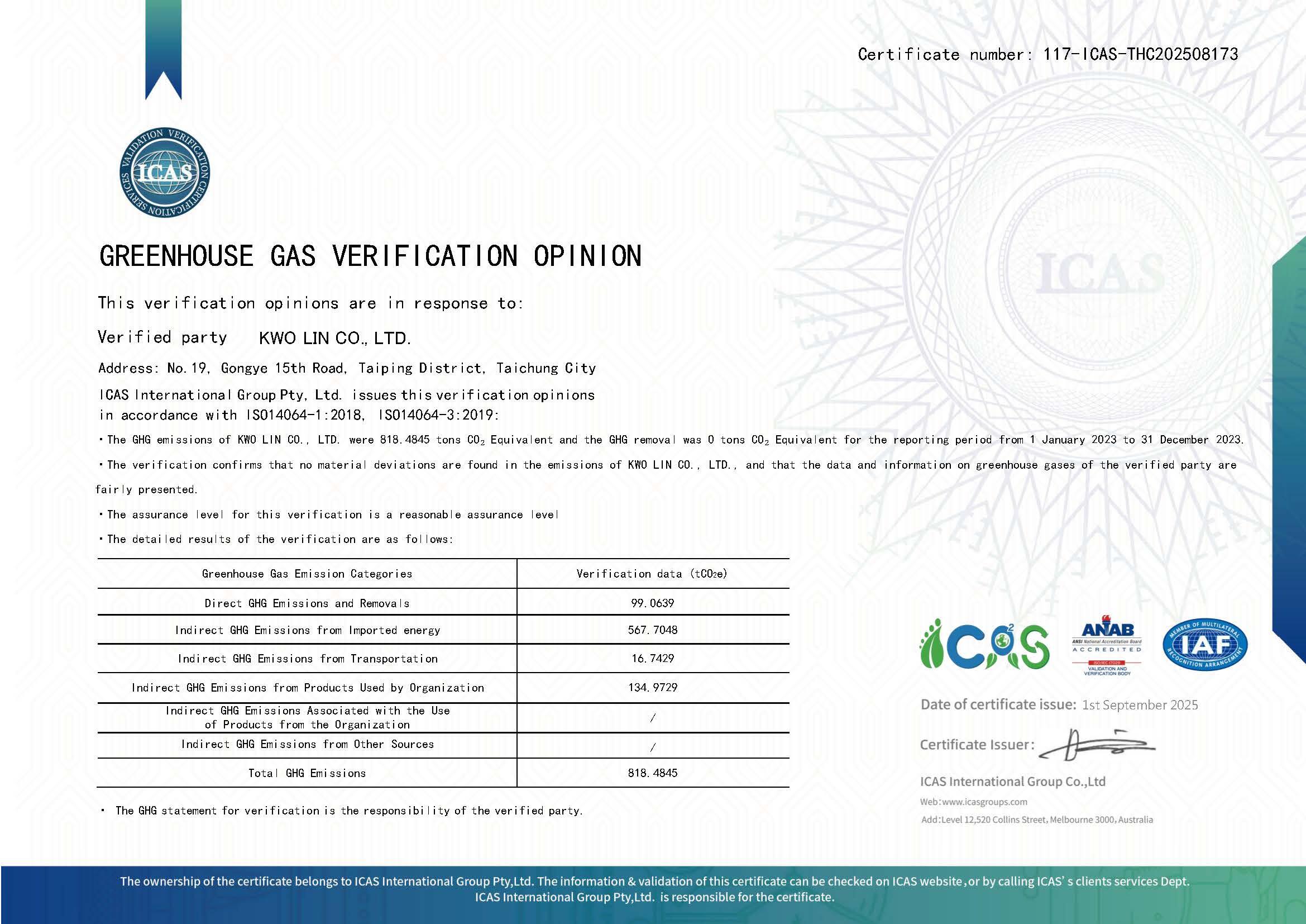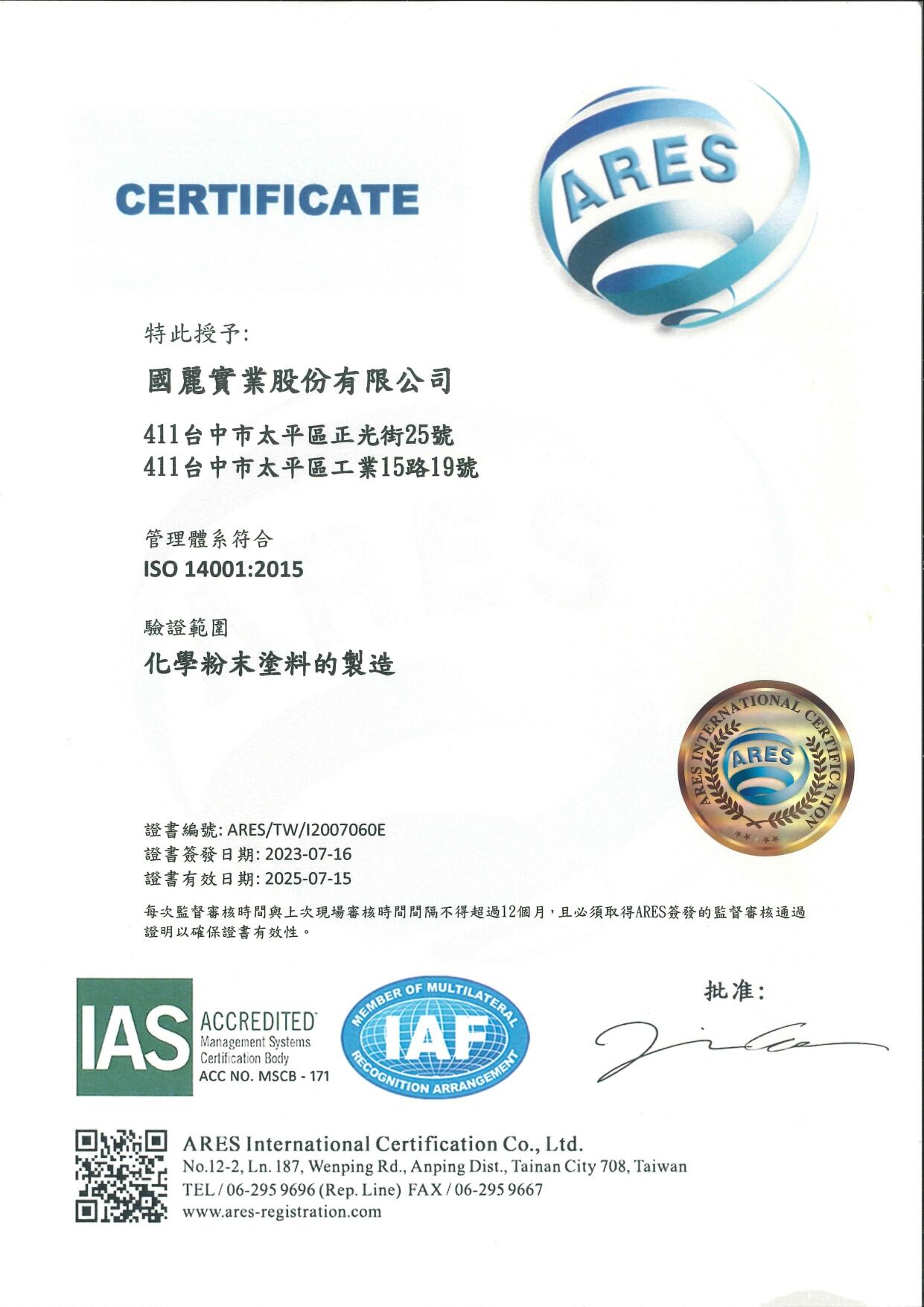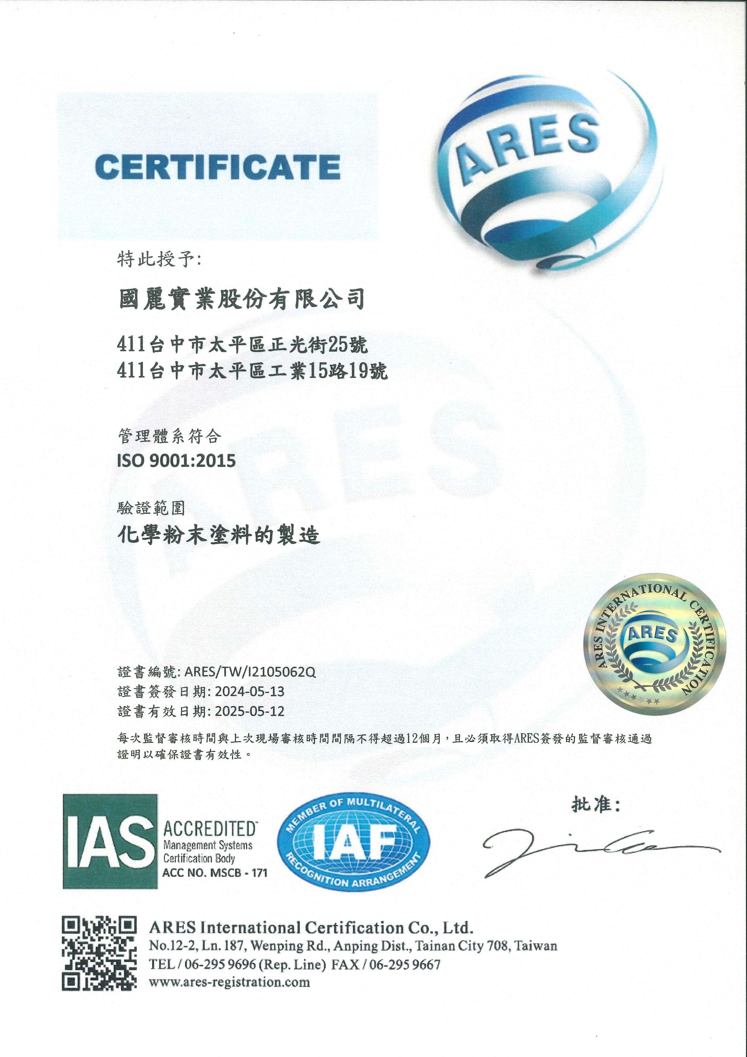 國麗通過ISO 9001:2015、 ISO 14001:2015、ISO14064-1:2018、ISO14064-3:2019、IATF 16949:2016 專業認證